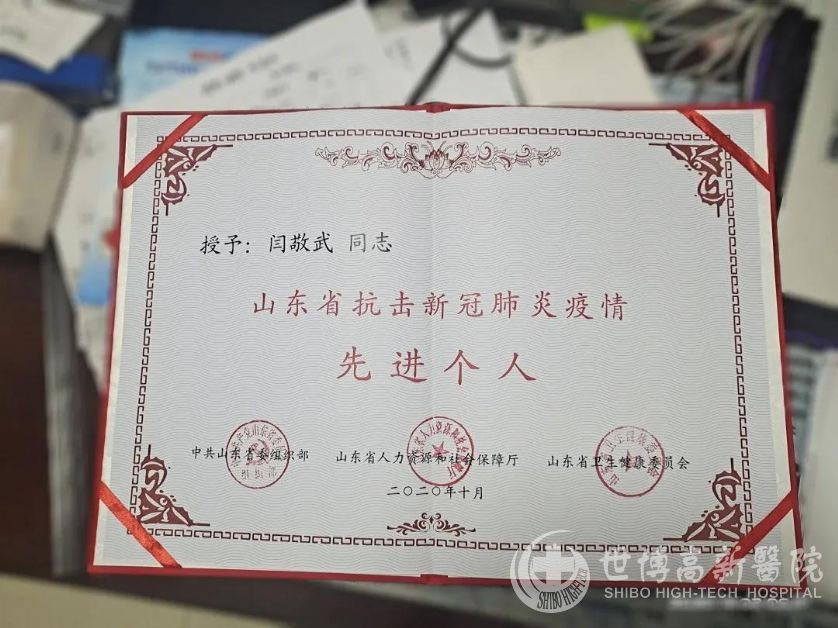 2020年10月,中共山东省委组织部、山东省人力资源和社会保障厅、山东省卫健委联合表彰抗击新冠肺炎疫情先进个人和先进集体,世博高新医院 闫敬武院长荣获“山东省抗击新冠肺炎疫情先进个人”荣誉称号。
