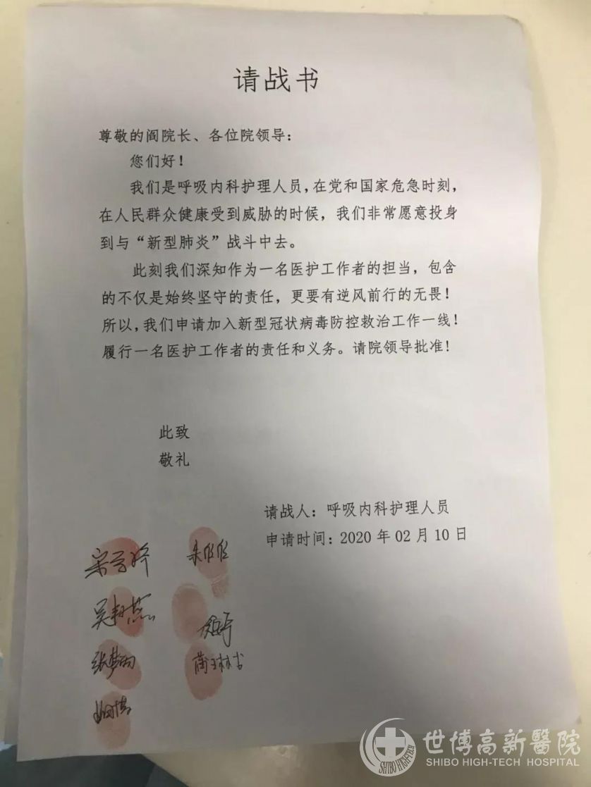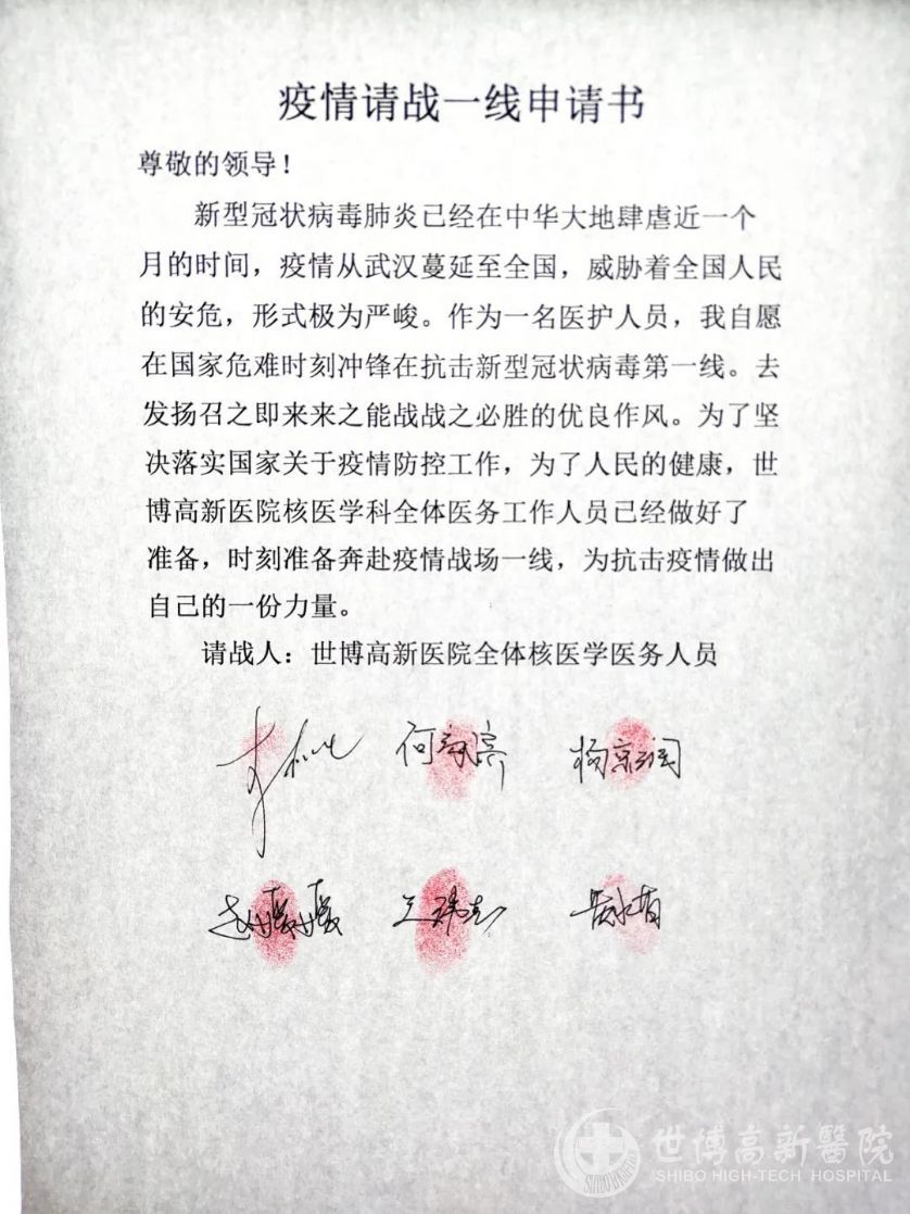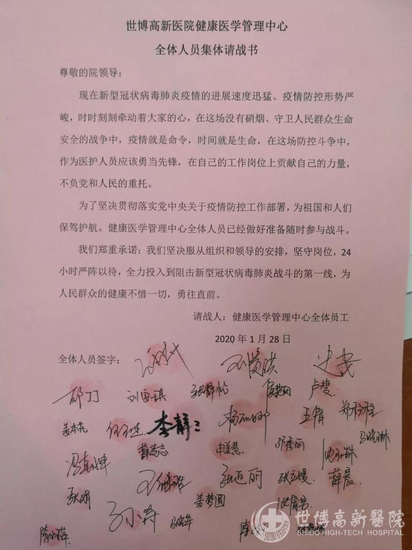 2020年2月13日,世博高新医院发布临床医学检验中心全体人员请战书。春节期间,科室召开紧急会议,需加配人手,应对疫情期间检验工作。通知发出后,全体临检人员第一时间请命,他们表示:大局当前,作为一名临检人,工作是我们的职责,只希望这场战役早日结束!