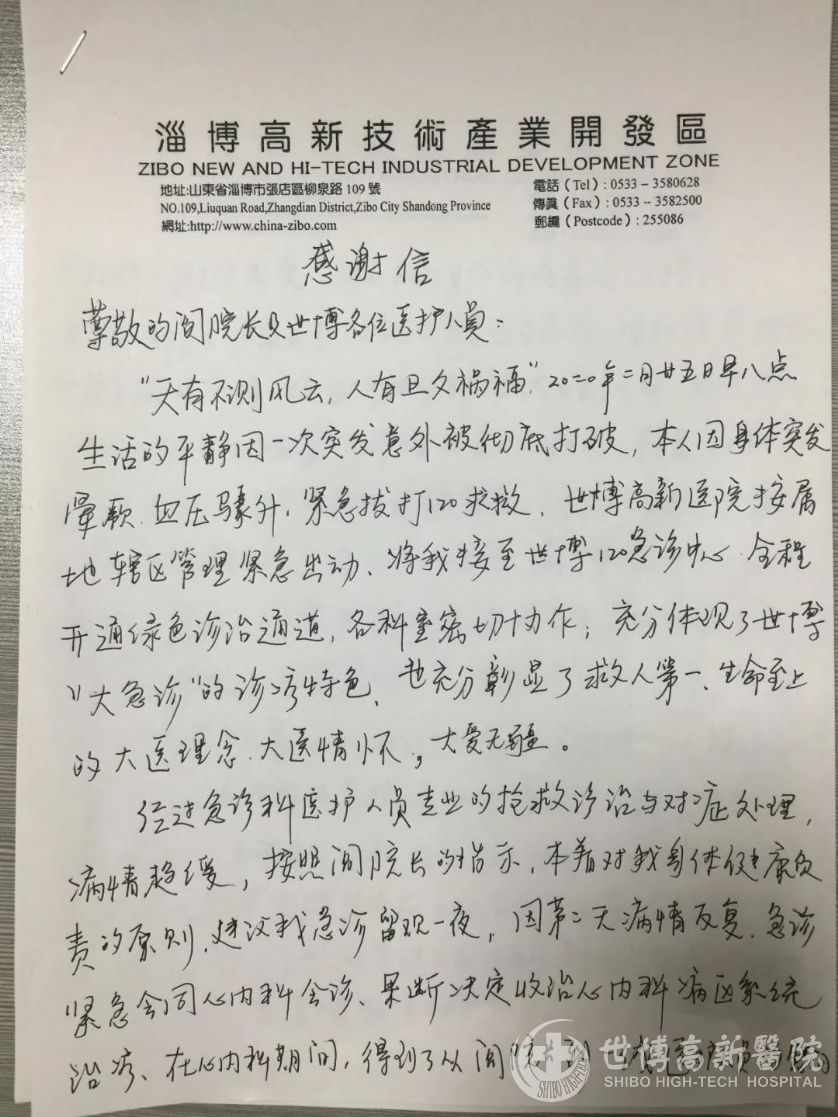 2020年3月,援鄂家属鹿先生将一封“千字感谢信”交给了前来进行例行查房的世博高新医院何小芳副院长。信中,鹿先生表达了三点谢意:一是阎院长的大爱之举,不仅及时开通绿色通道进行救治,更是负担了其全部救治费用,极大的减轻了家庭负担,让在前线的家人放心;二是感谢心内科全体医护人员的无微不至的照料;三是对社会各界的关注表示感谢。