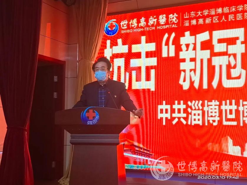 2020年3月3日,中共淄博世博高新医院党总支委员会响应党中央号召,举行“抗击新冠肺世博在行动”捐款仪式,党支部书记阎敬武同志参加仪式并发起倡议:“疫情无情 人间有爱,国家有难匹夫有责。”在抗“疫”的战线上,世博高新医院全员上阵,在奉献的道路上也没有一个人会掉队。本次捐款共分设主会场和分会场两个同时进行,全院职工踊跃捐款,400多人奉献爱心,捐款近10万元,用爱心汇聚暖流,用行动支援武汉!