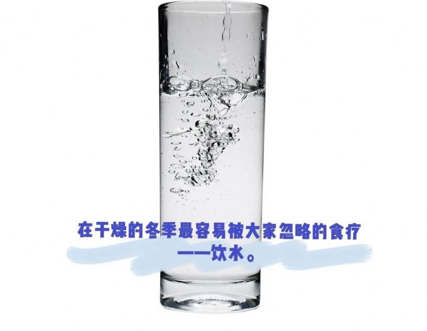 在干燥的冬季最容易被大家忽略的食疗——饮水。水是生命之源,每个人都离不开水,而在满是空调暖气的房间里最缺的就是水。成人每天应该饮用1500毫升~1700毫升白开水才能满足日常需求,而干燥的季节对水的需求量会更大。除了白开水外,淡茶水、柠檬水也是不错的选择,被干燥折磨得心浮气躁的人不妨一试。
