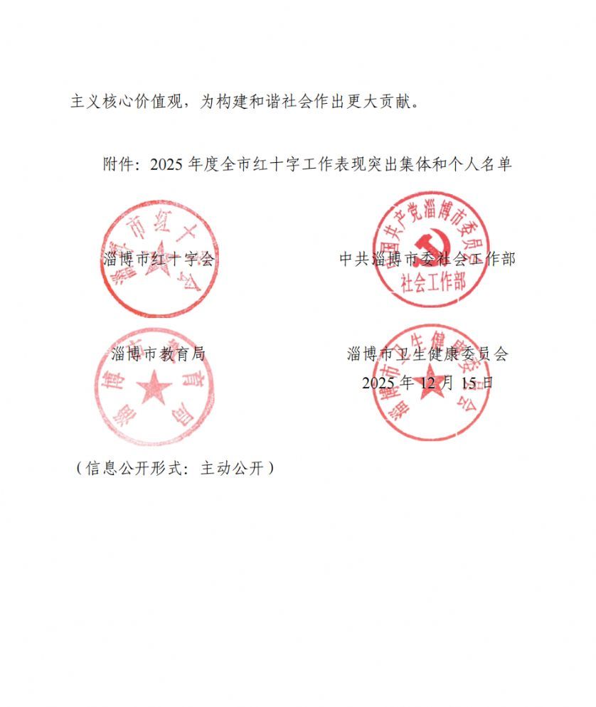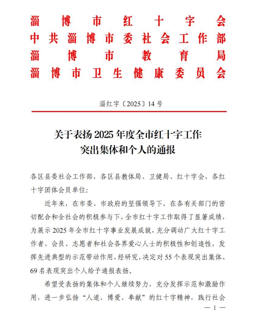 近日,淄博市红十字会、中共淄博市委社会工作部、淄博市教育局、淄博市卫生健康委员会联合发布《关于表扬2025年度全市红十字工作突出集体和个人的通报》,世博高新医院凭借在红十字公益事业中的扎实作为与突出贡献,获评2025年度全市“表现突出红十字会会员”荣誉称号。