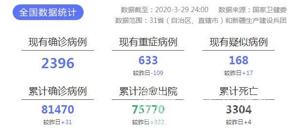 3月29日0—24时,31个省(自治区、直辖市)和新疆生产建设兵团报告新增确诊病例31例,其中境外输入病例30例,本土病例1例(甘肃1例);新增死亡病例4例(湖北4例);新增疑似病例17例,均为境外输入病例。