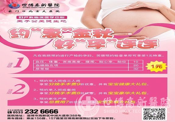 妇产科是山东大学齐鲁医院的重点科室,是国家级级重点学科,在全国都名列前茅。本周齐鲁医院妇产专家张向宁教授的到来,可以让淄博人民在家门口就能享受到齐鲁医院先进的医疗服务。如果您或您的家人有妇科方面的疾病困惑,抓紧时间到世博高新医院,让山东大学齐鲁医院妇产科专家为您诊治。本周五周六(9月22日-23日)上午,山东大学齐鲁医院妇科专家将在世博高新医院举行妇产科大型检查义诊。参与本次妇产科大型普查义诊的患者可以享受很多优惠,具体有:1、子宫肌瘤彩超筛查只需1元,2、孕妇孕检(含尿常规、血细胞五项、血压、体重、宫底高度、腹围、胎心率、胎位检查) 1元,3、宫颈癌筛查(液基薄层细胞制片术)7折优惠。